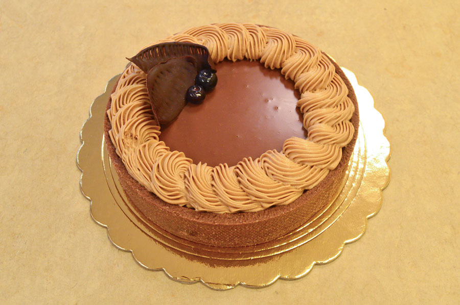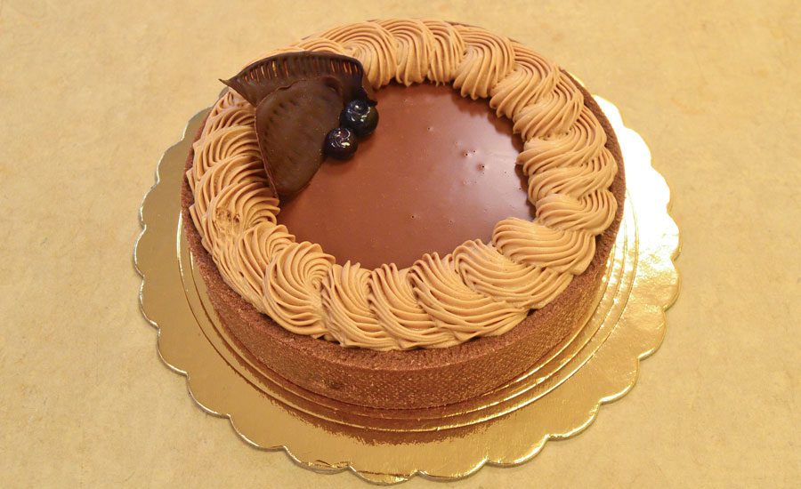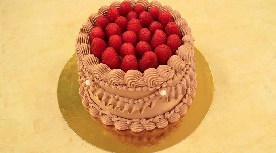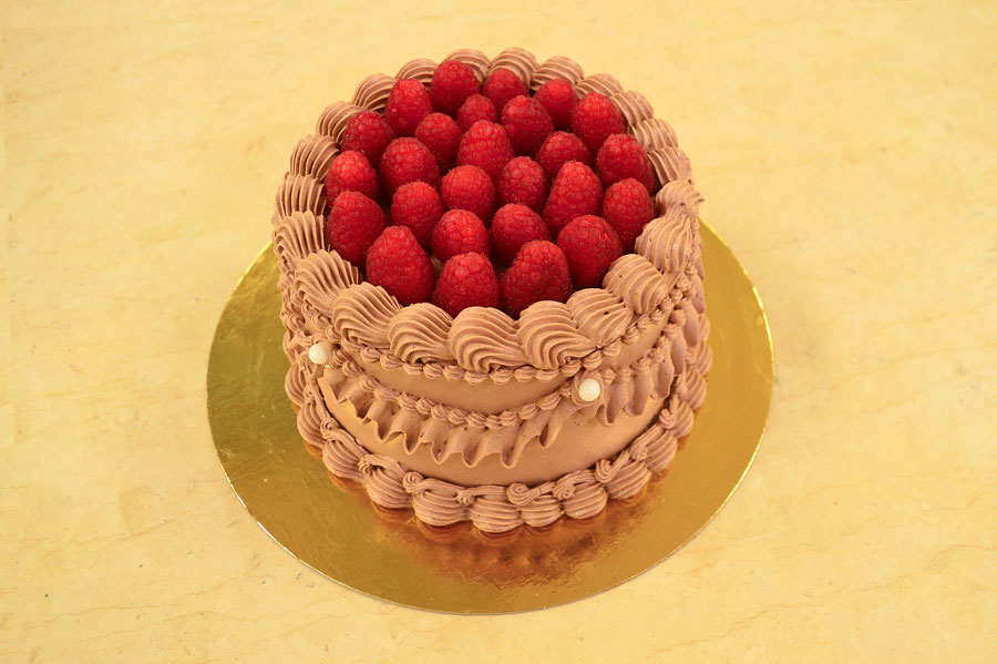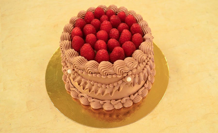 Base di torta al cioccolato con bagna al latte e vaniglia, farcita con crema montata al mascarpone e curd ai frutti di bosco, strutturata in tre strati. Il dolce è ricoperto e decorato con crema al burro meringata alla svizzera al cioccolato.