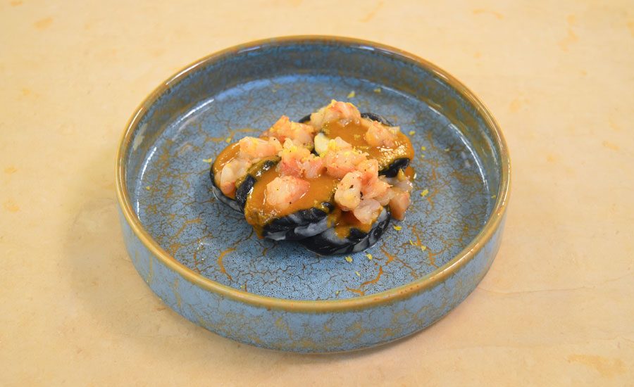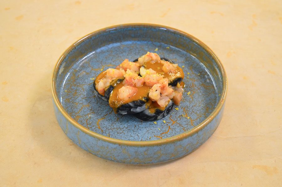Culurgiones tondi bicolore al nero di seppia, farciti con baccalà mantecato arricchito da patate, serviti con bisque di granchio blu e accompagnati da tartare di gambero.