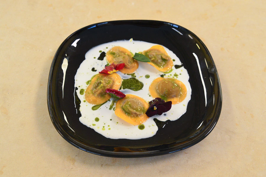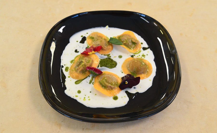 Pasta ripiena: ravioli di melanzane, serviti con colatura di provola e salsa al basilico.