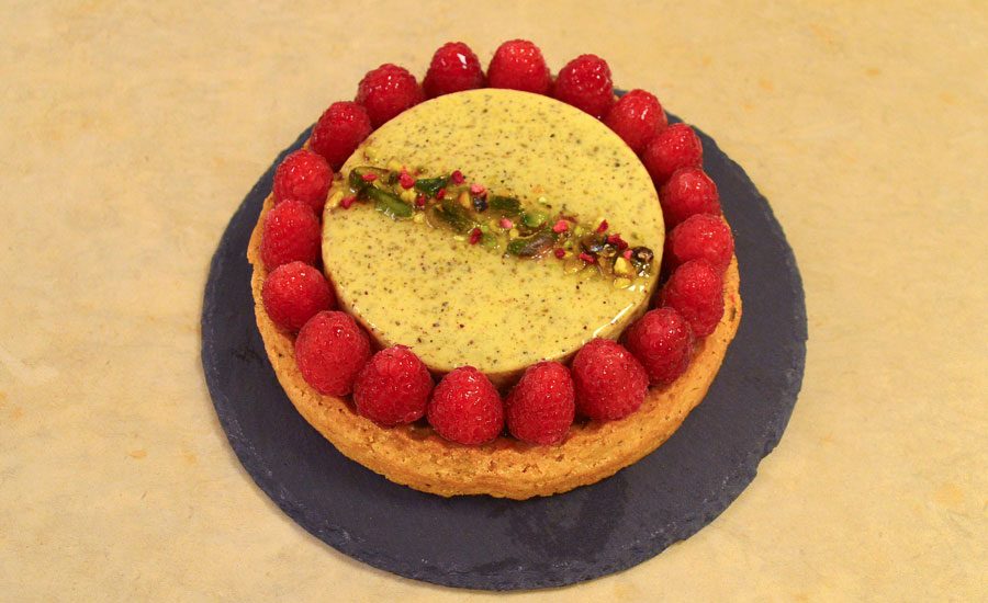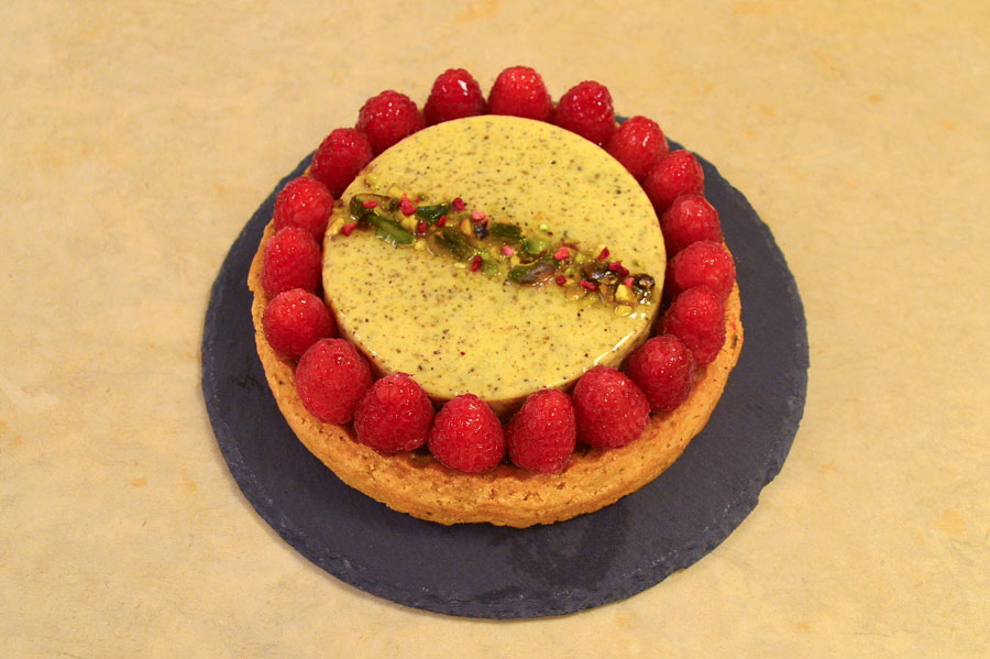 Pasta frolla al pistacchio leggermente salata, con frangipane al pistacchio, sottile strato di confit al lampone e finitura con bavarese ghiacciata al pistacchio, decorata con lamponi glassati e pistacchi.