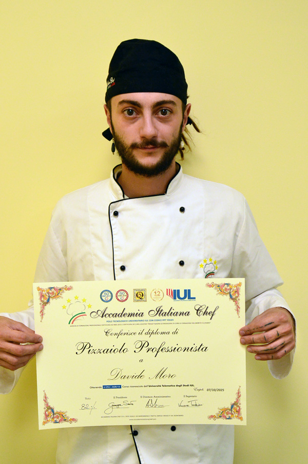 Nella sessione d’esame si è diplomato anche 1 bravissimo pizzaiolo: Davide Moro al quale è stato riconosciuto il diploma Accademico. Il Neo Diplomato ha dimostrato di aver raggiunto un ottimo livello di competenze professionali che gli consentiranno di affrontare con successo la carriera lavorativa futura. Il Diploma di Pizzaiolo Professionista è stato conseguito all’allievo dopo un percorso di lezioni teorico-pratiche presso l’Accademia, uno stage di 200 ore presso una Pizzeria, al quale poi ha fatto seguito la prova d’esame. Il bagaglio di conoscenze appreso sarà ora necessario per entrare nel mondo del lavoro, sia in Italia che all’estero.