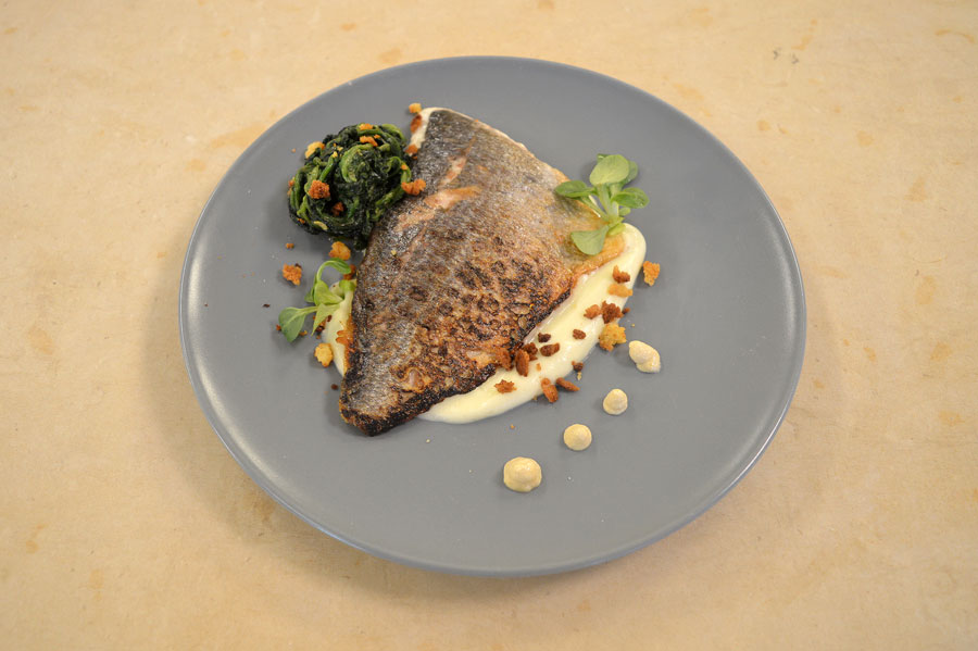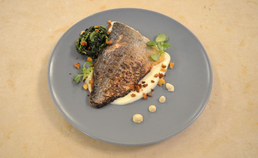 Orata CBT con crema di cavolfiore, cicoria ripassata con zest di limone, crumble di pane e crema all’olio di limone.