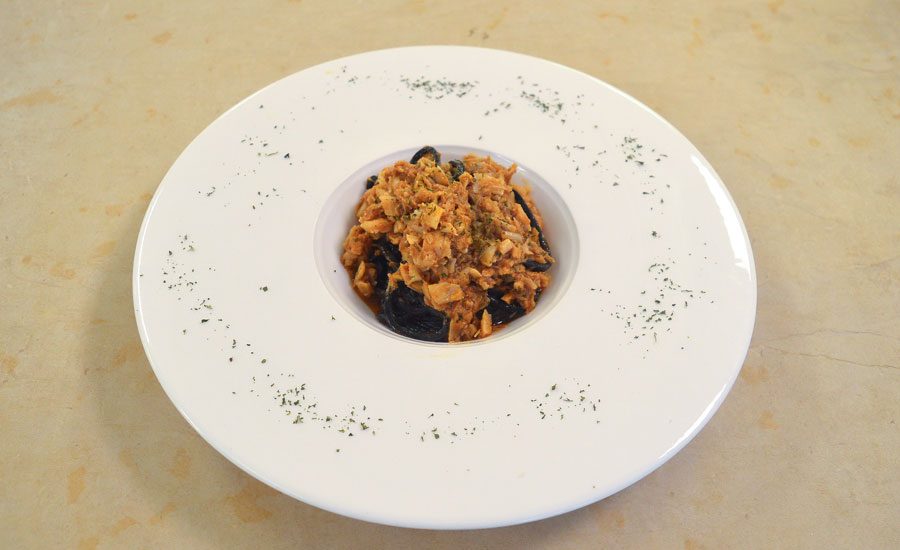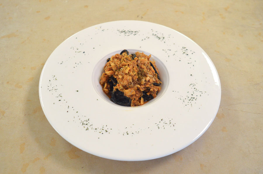 Spaghetto alla chitarra al carbone vegetale con stoccafisso rosso, pomodoro, tonno, alici, prezzemolo e peperoncino.