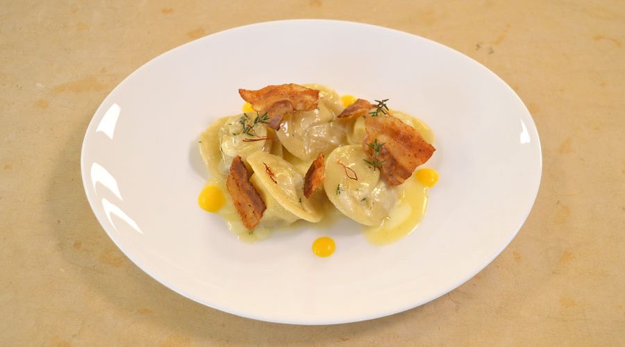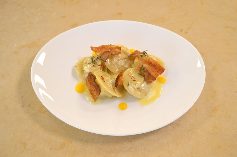 Pasta ripiena di patata rossa di Cetica, formaggio abbucciato aretino, lamelle croccanti di pancetta “tarese del Valdarno”, olio allo zafferano, pistilli di zafferano essiccato e timo fresco.