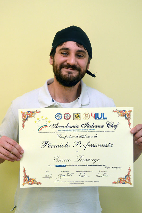 Nella sessione d’esame si è diplomato anche 1 bravissimo pizzaiolo: Enrico Sessarego al quale è stato riconosciuto il diploma Accademico. Il Neo Diplomato ha dimostrato di aver raggiunto un ottimo livello di competenze professionali che gli consentiranno di affrontare con successo la carriera lavorativa futura. Il Diploma di Pizzaiolo Professionista è stato conseguito dall’allievo dopo un percorso di lezioni teorico-pratiche presso l’Accademia, uno stage di 200 ore presso una Pizzeria, al quale poi ha fatto seguito la prova d’esame. Il bagaglio di conoscenze appreso sarà ora necessario per entrare nel mondo del lavoro, sia in Italia che all’estero.