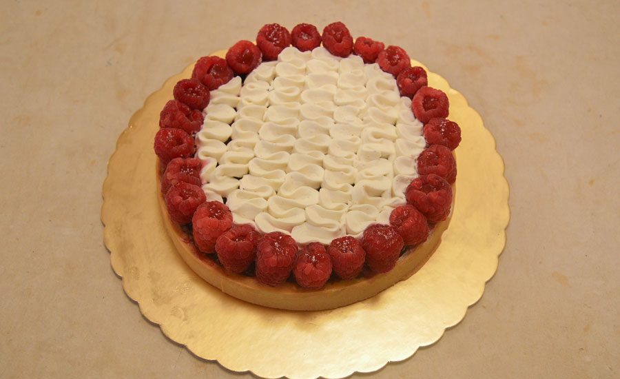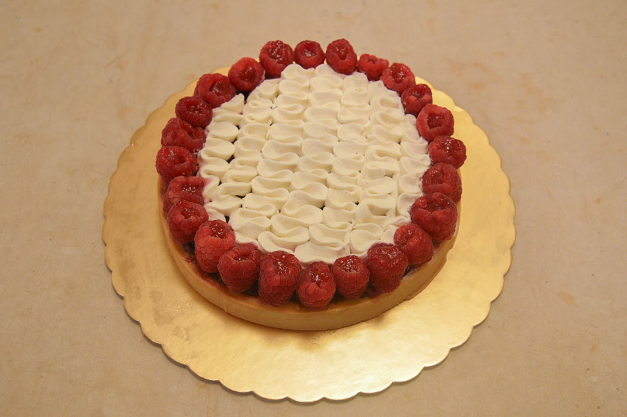 Frolla Milano classica, frangipane alle mandorle e cioccolato fondente, gelée di lamponi, ganache montata alla vaniglia.