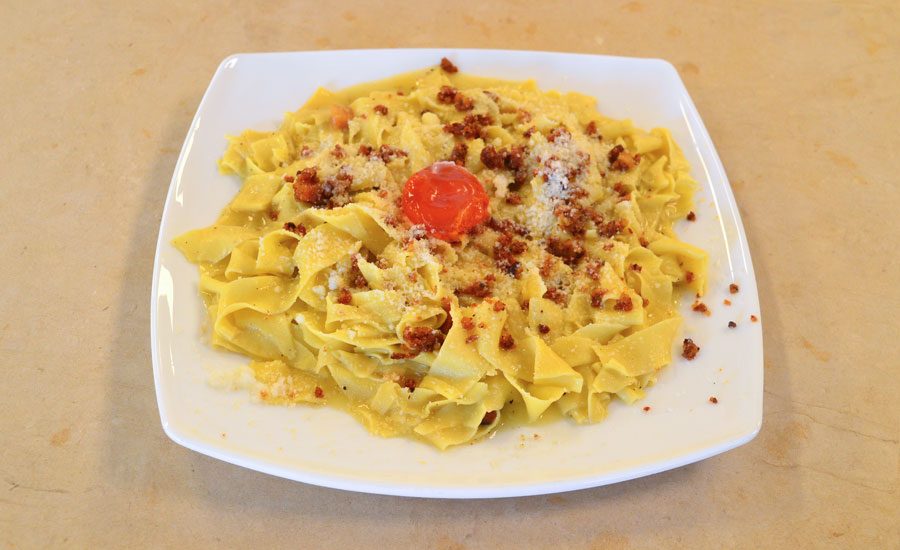 Pasta fresca fatta a mano, servita con tuorlo marinato sotto sale, guanciale cotto in forno e ridotto in polvere, accompagnata da brodo vegetale.