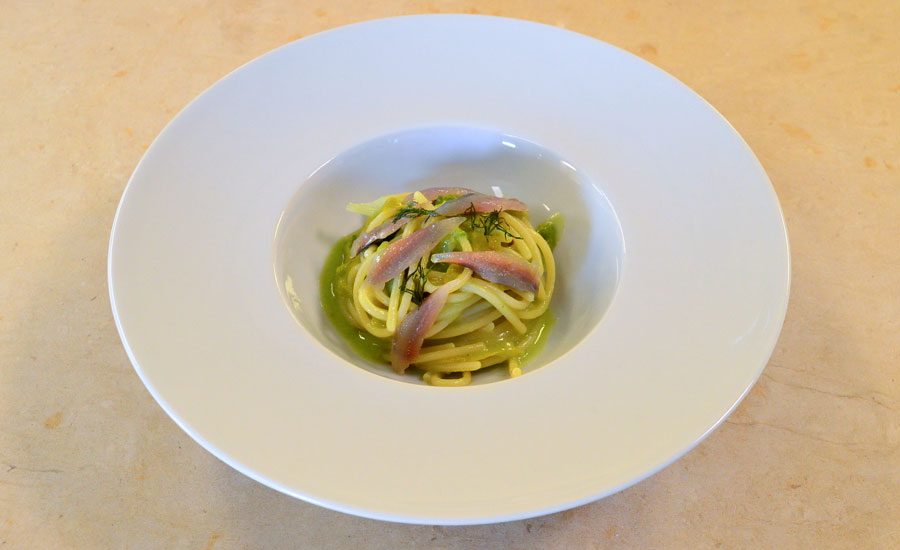 Spaghetto con scarola, burro, alici e bergamotto, arricchito da acqua di scarola, alici in salamoia e cuore di scarola utilizzato per la mantecatura della pasta.