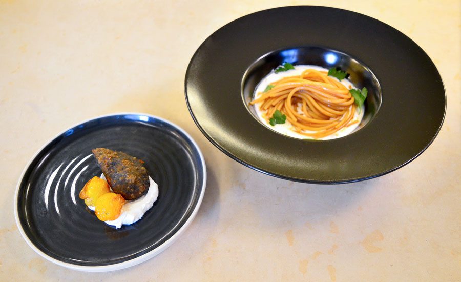 “Ho scelto di realizzare questo piatto ispirandomi alla cucina del Sig. Pinchiorri e ai suoi gusti culinari. Ho voluto reinterpretare queste influenze in chiave personale, cercando un equilibrio tra mare e cremosità”.