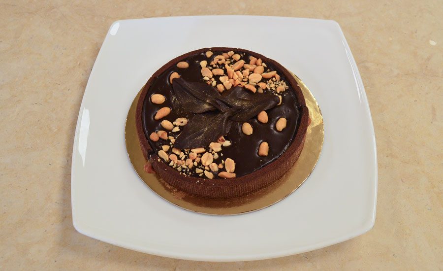 Frolla al cacao con caramello salato, ganache al cioccolato e arachidi salate in superficie.