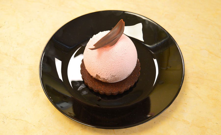 Base di frolla al cacao, biscuit al lampone, gelée al lampone e mousse al cioccolato fondente, rifinita con spray effetto velluto e decorazione in foglia di cioccolato fondente.