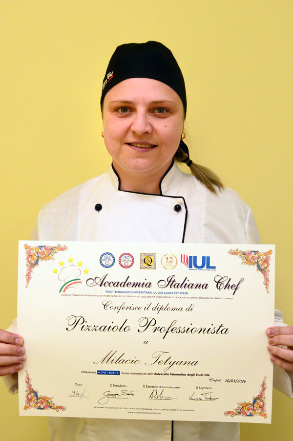 Nella sessione d’esame si sono diplomati anche 3 bravissimi pizzaioli: Hamandy Sane, Agnese Trudu e Milacic Tetyana ai quali sono stati riconosciuti i diplomi Accademici. I Neo Diplomati hanno dimostrato di aver raggiunto un ottimo livello di competenze professionali che gli consentiranno di affrontare con successo la carriera lavorativa futura. Il Diploma di Pizzaiolo Professionista è stato conseguito dagli allievi dopo un percorso di lezioni teorico-pratiche presso l’Accademia, uno stage di 200 ore presso una Pizzeria, al quale poi ha fatto seguito la prova d’esame. Il bagaglio di conoscenze appreso sarà ora necessario per entrare nel mondo del lavoro, sia in Italia che all’estero.