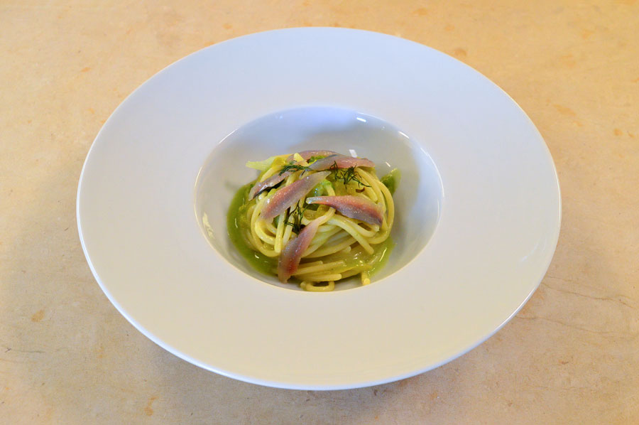 Spaghetto con scarola, burro, alici e bergamotto, arricchito da acqua di scarola, alici in salamoia e cuore di scarola utilizzato per la mantecatura della pasta.