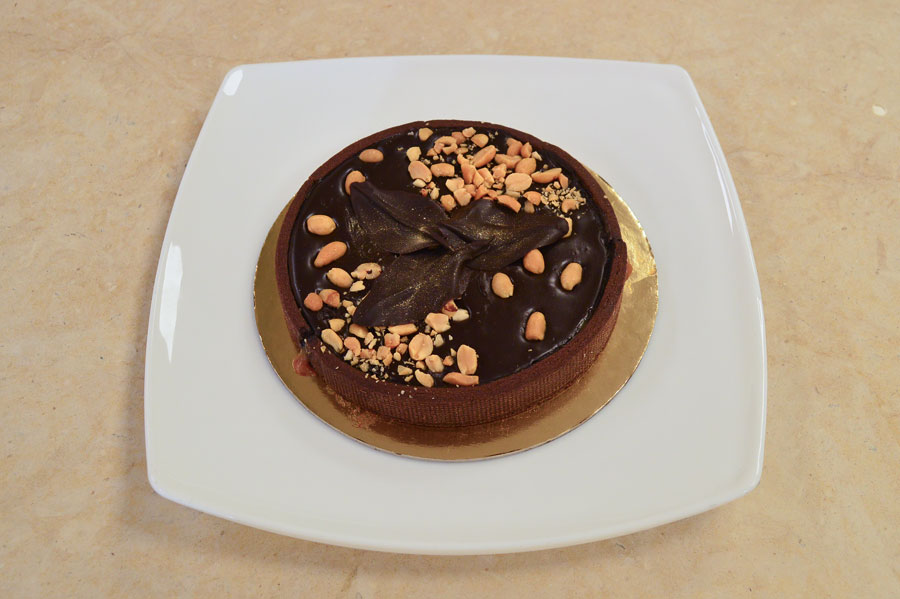 Frolla al cacao con caramello salato, ganache al cioccolato e arachidi salate in superficie.