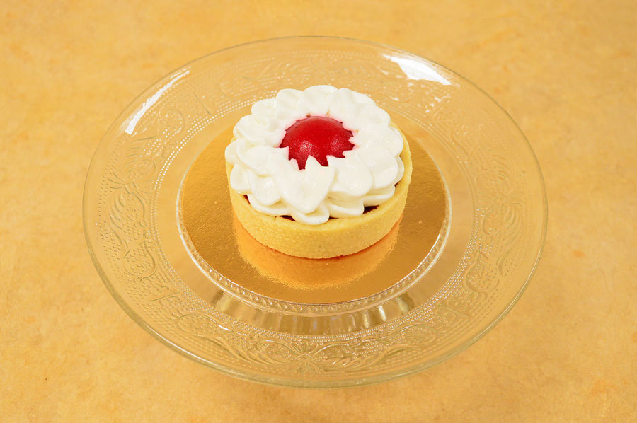 Base di frolla al cocco con ganache al cioccolato, sormontata da una mezza sfera di gelée al lampone e avvolta da mousse al cocco.