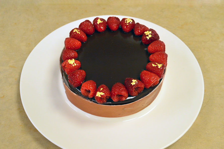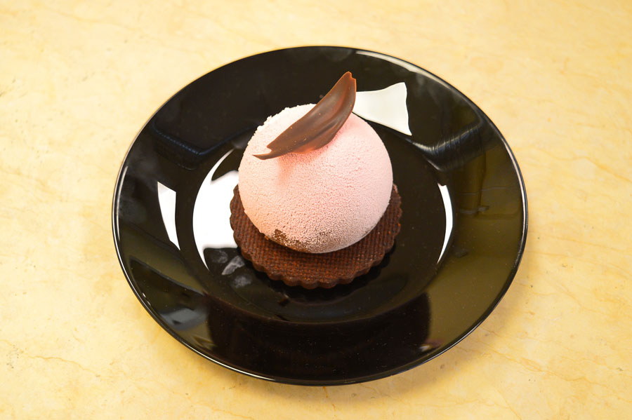 Base di frolla al cacao, biscuit al lampone, gelée al lampone e mousse al cioccolato fondente, rifinita con spray effetto velluto e decorazione in foglia di cioccolato fondente.