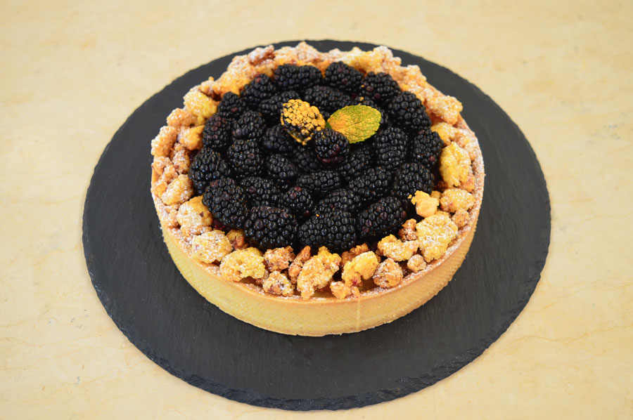 Frolla al mais, financier al mais e mandorle, crema al limone e vaniglia, gelée alle more e crumble al mais fioretto.