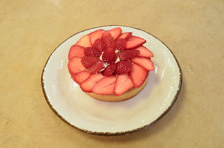Base di pasta frolla con marmellata di fragole, strato di fragole fresche, crema pasticcera e crema diplomatica.