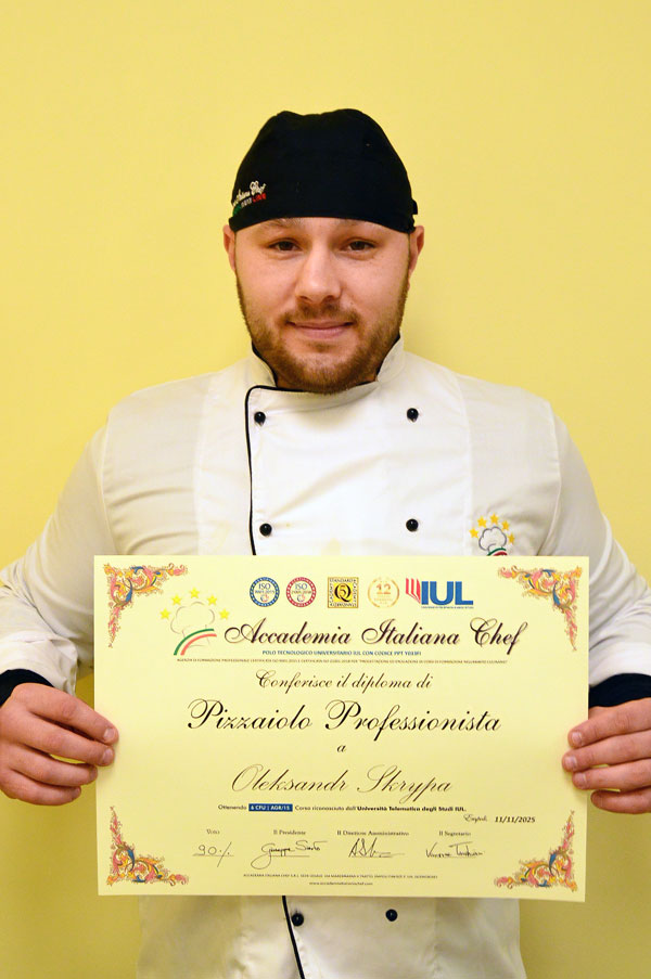Nella sessione d’esame si sono diplomati anche 2 bravissimi pizzaioli: Oleksandr Skrypa e Jhohar Moncada ai quali sono stati riconosciuti i diplomi Accademici. I Neo Diplomati hanno dimostrato di aver raggiunto un ottimo livello di competenze professionali che gli consentiranno di affrontare con successo la carriera lavorativa futura. Il Diploma di Pizzaiolo Professionista è stato conseguito dagli allievi dopo un percorso di lezioni teorico-pratiche presso l’Accademia, uno stage di 200 ore presso una Pizzeria, al quale poi ha fatto seguito la prova d’esame. Il bagaglio di conoscenze appreso sarà ora necessario per entrare nel mondo del lavoro, sia in Italia che all’estero.