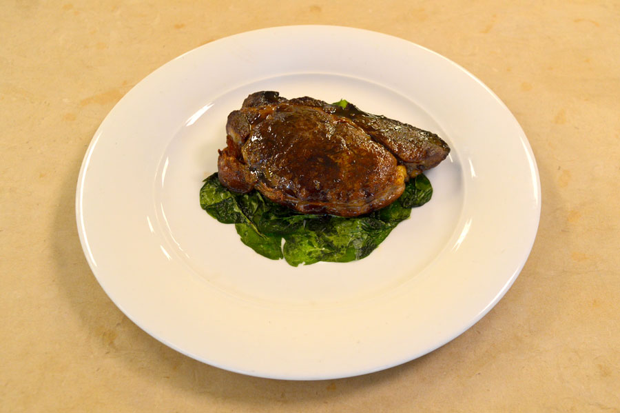 Medaglioni di filetto di manzo in doppia cottura, con riduzione al Chianti e spinacino croccante.