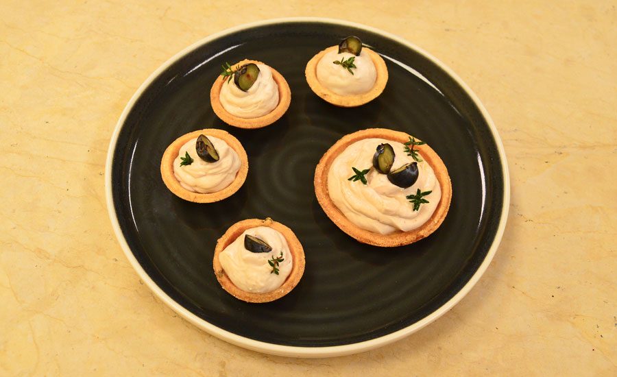 Frolla classica alle erbe, mousse di castagne, decorazione con mirtilli, miele e timo.