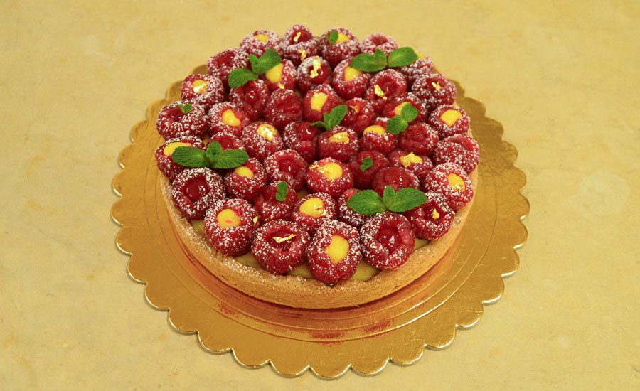 Base di pasta frolla con zucchero moscovado, crema pasticcera, gelée ai lamponi e lamponi freschi.