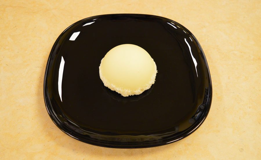 Dacquoise al cocco e mandorle, mousse al cioccolato bianco e cocco, pralinato alle mandorle, ricopertura di cioccolato bianco e decorazione con striscia di cocco rapé.