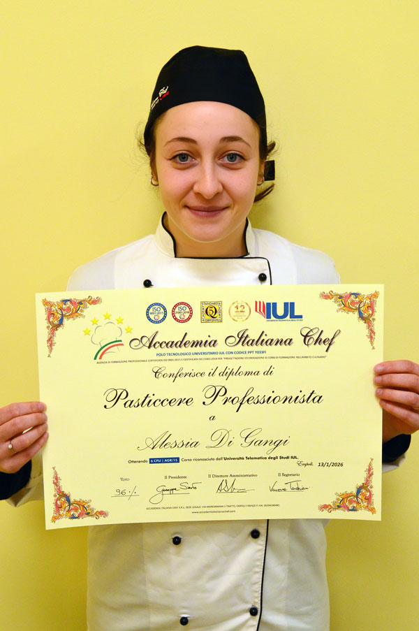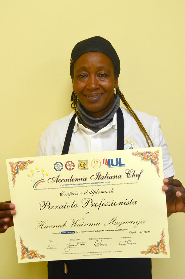 Nella sessione d’esame si è diplomata anche una bravissima pizzaiola: Hanna Wairimu Mugwanja alla quale è stato riconosciuto il diploma Accademico. La Neo Diplomata ha dimostrato di aver raggiunto un ottimo livello di competenze professionali che le consentiranno di affrontare con successo la carriera lavorativa futura. Il Diploma di Pizzaiolo Professionista è stato conseguito dall’allieva dopo un percorso di lezioni teorico-pratiche presso l’Accademia, uno stage di 200 ore presso una Pizzeria, al quale poi ha fatto seguito la prova d’esame. Il bagaglio di conoscenze appreso sarà ora necessario per entrare nel mondo del lavoro, sia in Italia che all’estero.