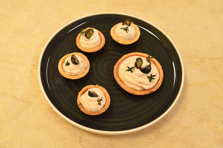 Frolla classica alle erbe, mousse di castagne, decorazione con mirtilli, miele e timo.