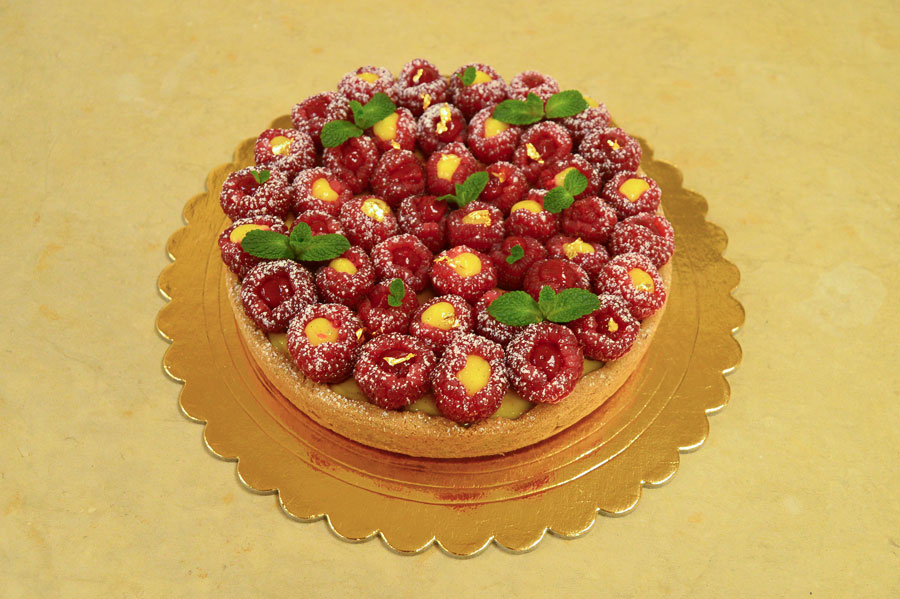 Base di pasta frolla con zucchero moscovado, crema pasticcera, gelée ai lamponi e lamponi freschi.