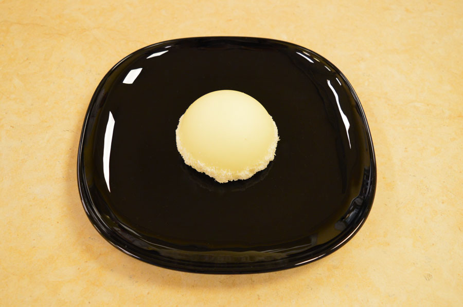 Dacquoise al cocco e mandorle, mousse al cioccolato bianco e cocco, pralinato alle mandorle, ricopertura di cioccolato bianco e decorazione con striscia di cocco rapé.