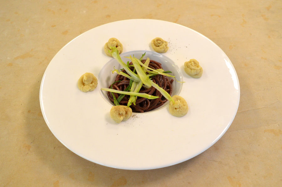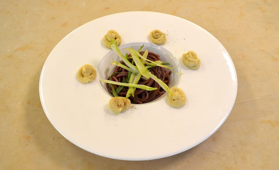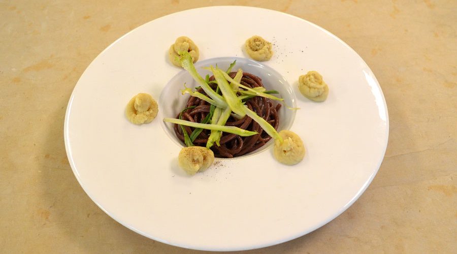Spaghetti cacio e pepe “risottati” e completati nella cottura con vino Primitivo, con l’aggiunta di fiocchi di purè di fave e puntarelle fresche per una nota croccante.