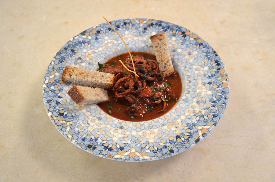 Ravioli fatti a mano ripieni di polpo, olive e zest di limone, crema di porro con panna e salsa di soia, con tentacoli di polpo bolliti e ripassati in padella.