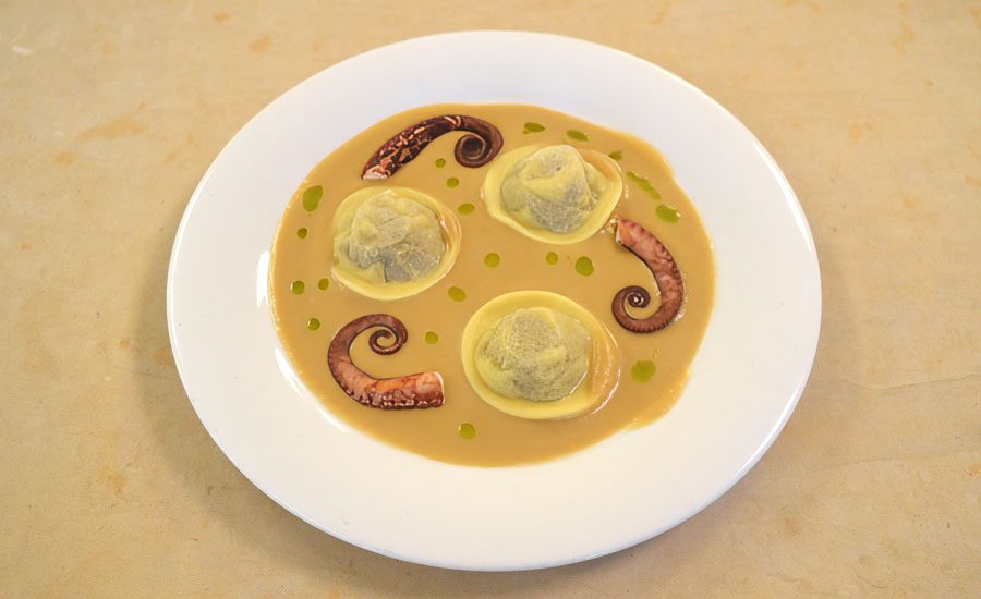 Fabio ha portato per deliziare la commissione d’esame un piatto dal nome Ravioli al Polpo di Olive.