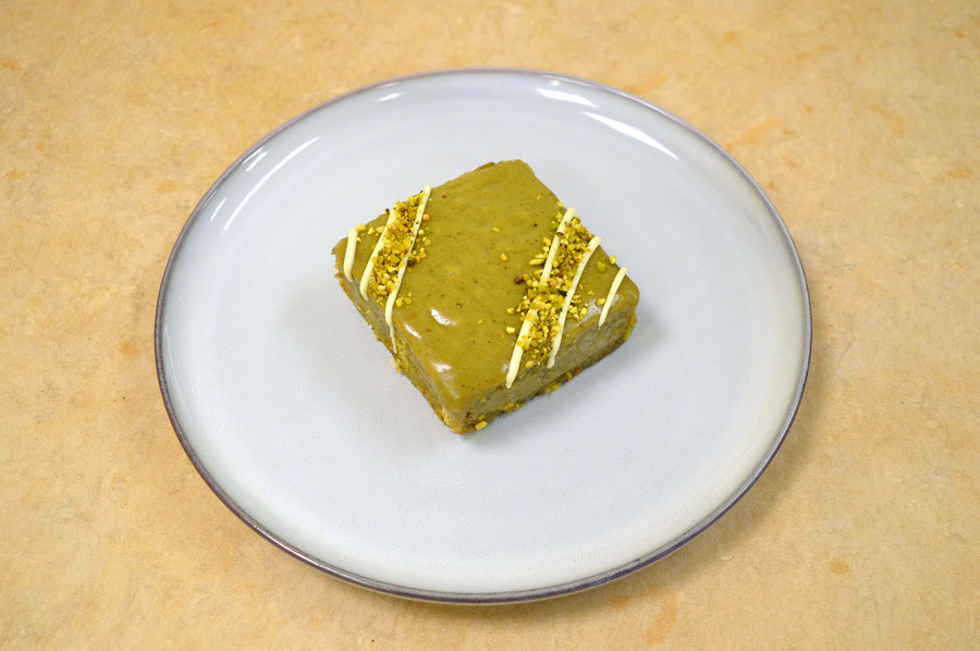 Base di torta al burro e pistacchio, crema al pistacchio e granella di pistacchio.