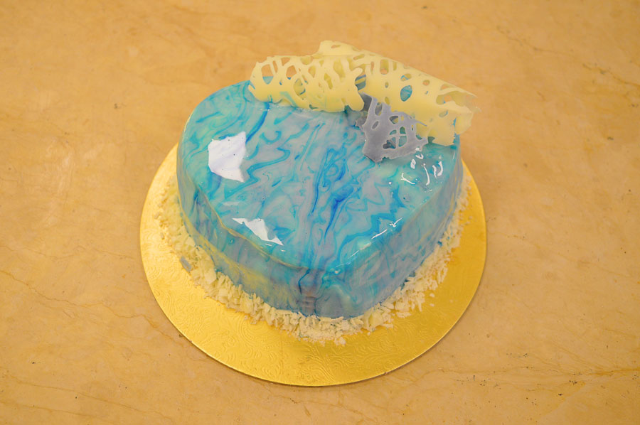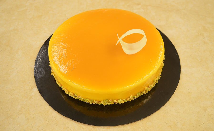 “Disco di daquoise alle mandorle, composta di mango, cremoso al pistacchio, secondo disco di daquoise alle mandorle, bavarese alla vaniglia, glassa al mango e passion fruit con granella di pistacchio”.