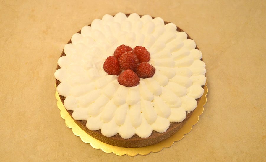 Frolla al cacao, ganache al cioccolato fondente, marmellata di lamponi, chantilly al mascarpone e lamponi freschi come decorazione.