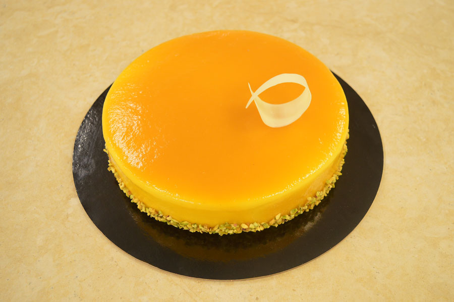 Disco di daquoise alle mandorle, composta di mango, cremoso al pistacchio, secondo disco di daquoise alle mandorle, bavarese alla vaniglia, glassa al mango e passion fruit con granella di pistacchio.
