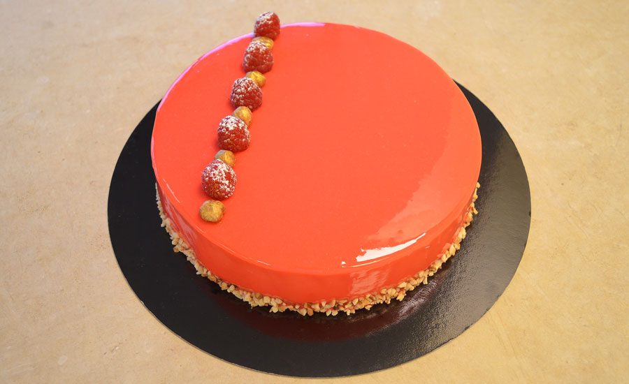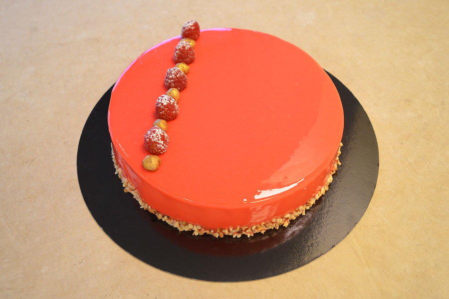 Crumble alla nocciola, inserto di bisquit al lampone con bagna al lampone, cremoso al gianduia, gelée di lamponi, mousse al mascarpone, rifinita con glassa a specchio rossa.