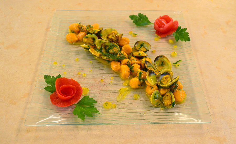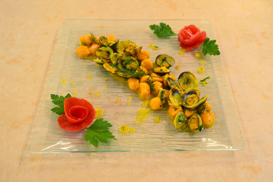 Gnocchi di patate dolci con vongole veraci, cime di rapa e zafferano.