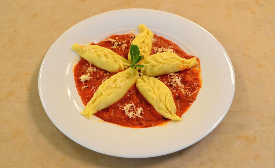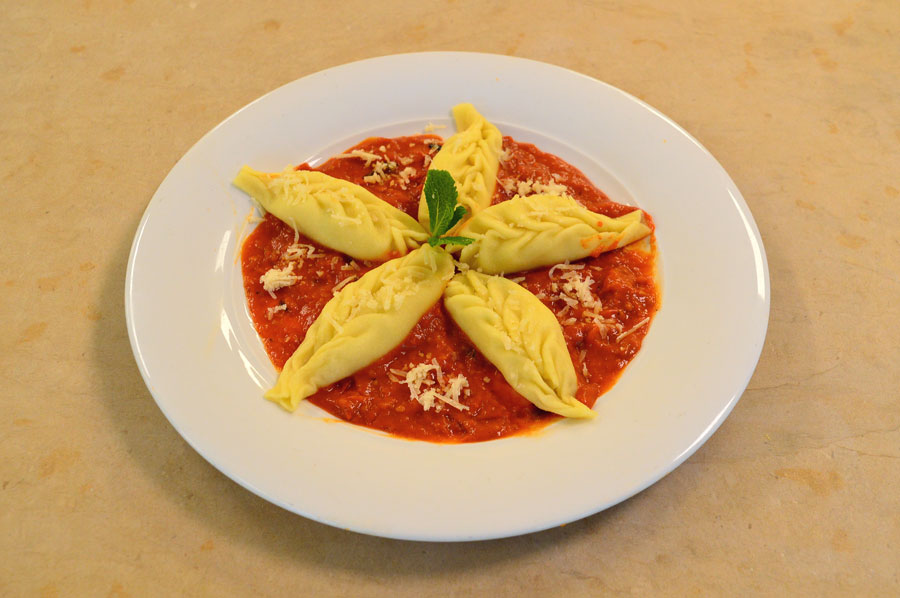 Culurgiones ripieni di patate, pecorino, menta e sale, con impasto di acqua e semola, serviti con salsa di datterini arrostiti e frullati.