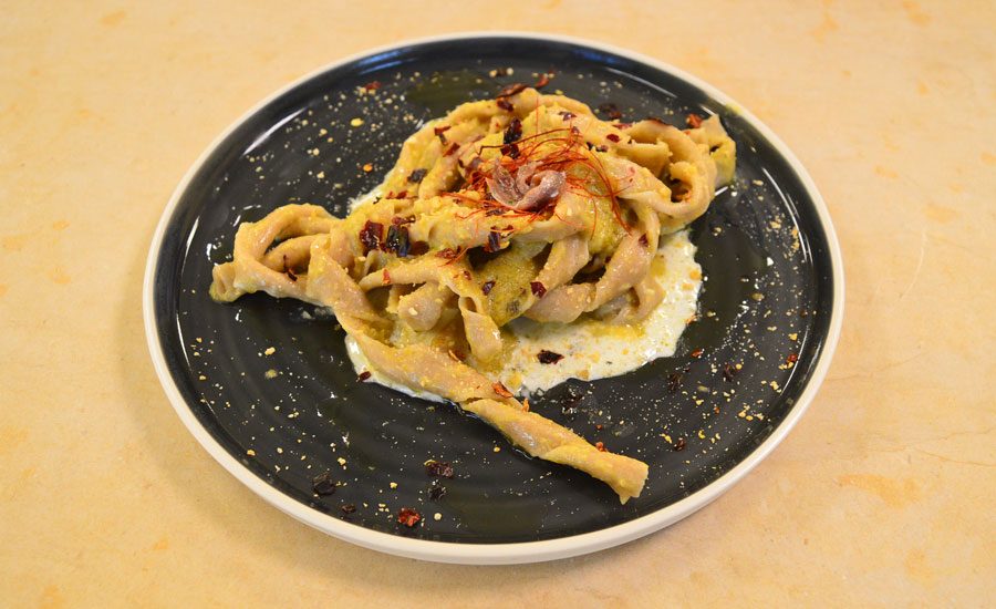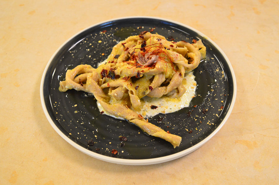 Pasta con crema di cime di rapa, zest di limone e alici su base di crema di burrata, condita con sale e olio, decorata con granella di peperone etrusco, tarallo sbriciolato e fili d’angelo al peperoncino.