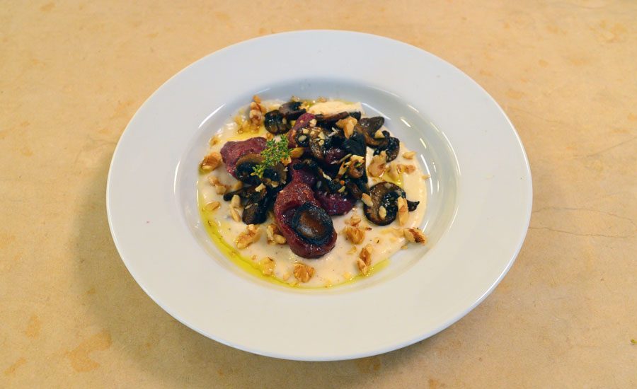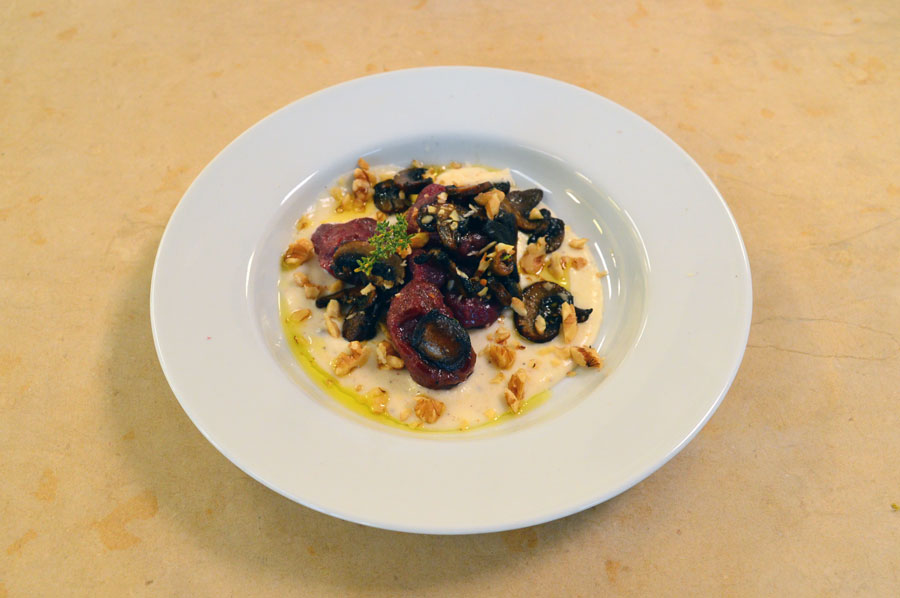Gnocchi di patate lessate con la buccia, impastati con barbabietola e farina 00, serviti con roux al parmigiano, funghi champignon e noci, decorati con timo fresco.