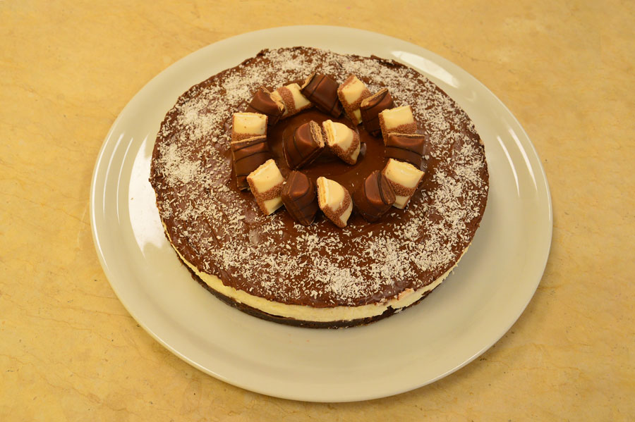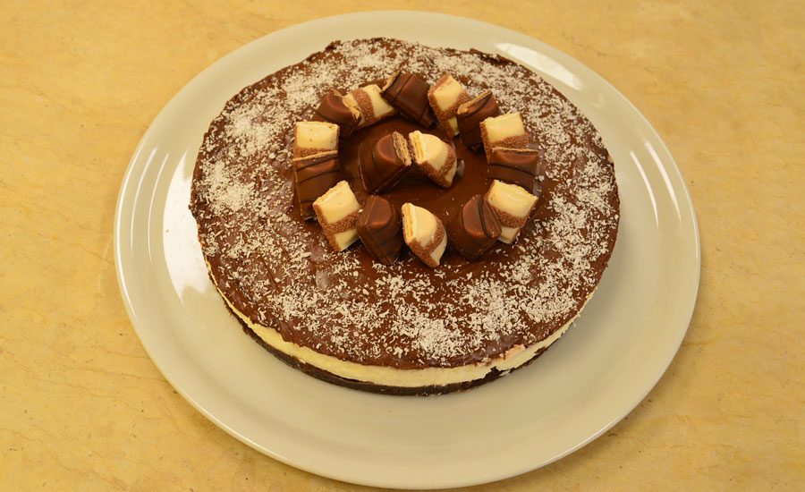 Cheesecake con base croccante di biscotto al cacao, crema al cocco, copertura di Nutella, decorata con cocco rapé e Kinder Bueno.