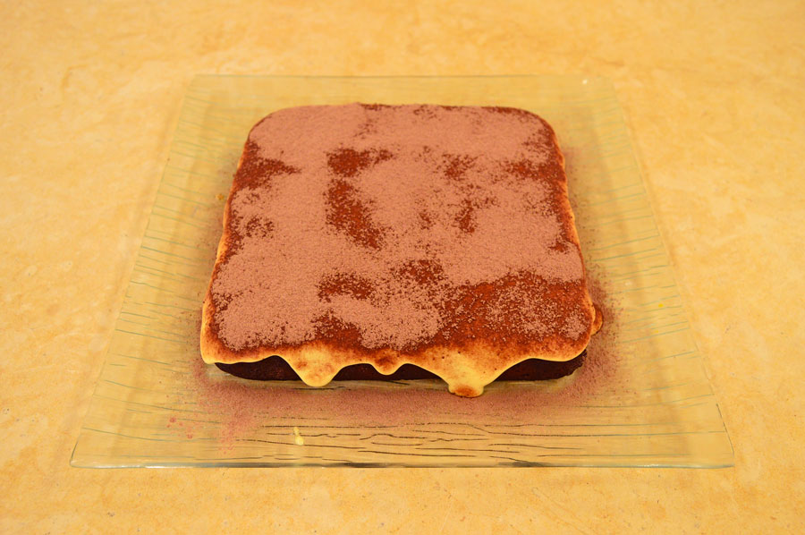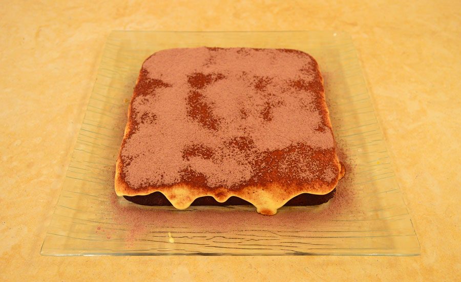 Base di brownie con crema al tiramisù, cacao zuccherato e ciuffi di crema.