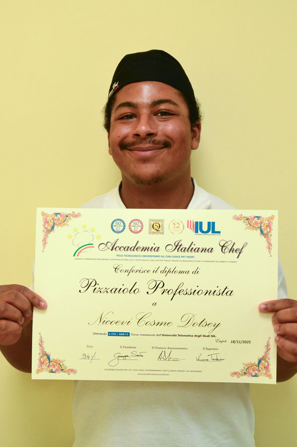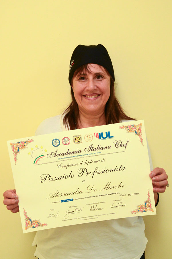 Nella sessione d’esame si sono diplomati anche 2 bravissimi pizzaioli: Alessandra De Marchi e Nocoevi Cosme Dotsey ai quali sono stati riconosciuti i diplomi Accademici. I Neo Diplomati hanno dimostrato di aver raggiunto un ottimo livello di competenze professionali che gli consentiranno di affrontare con successo la carriera lavorativa futura. Il Diploma di Pizzaiolo Professionista è stato conseguito dagli allievi dopo un percorso di lezioni teorico-pratiche presso l’Accademia, uno stage di 200 ore presso una Pizzeria, al quale poi ha fatto seguito la prova d’esame. Il bagaglio di conoscenze appreso sarà ora necessario per entrare nel mondo del lavoro, sia in Italia che all’estero.