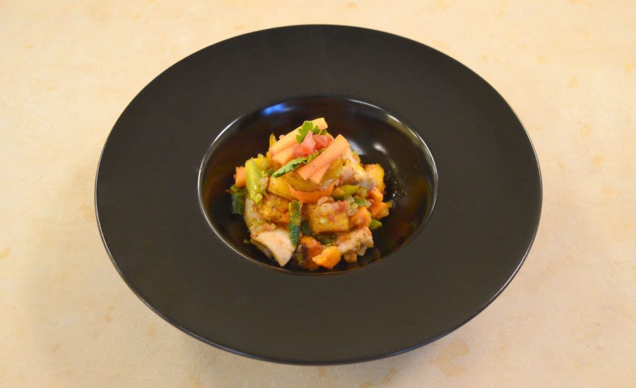 Pollo, platano e mix di verdure e ortaggi. Il platano viene fritto, il pollo rosolato in frittura; le verdure sono tagliate e cucinate con pepe bianco e curry dolce.