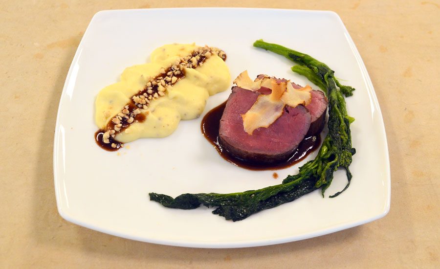 Filetto di manzo grigliato con demi-glace, purè di patate, cime di rapa e nocciole.
