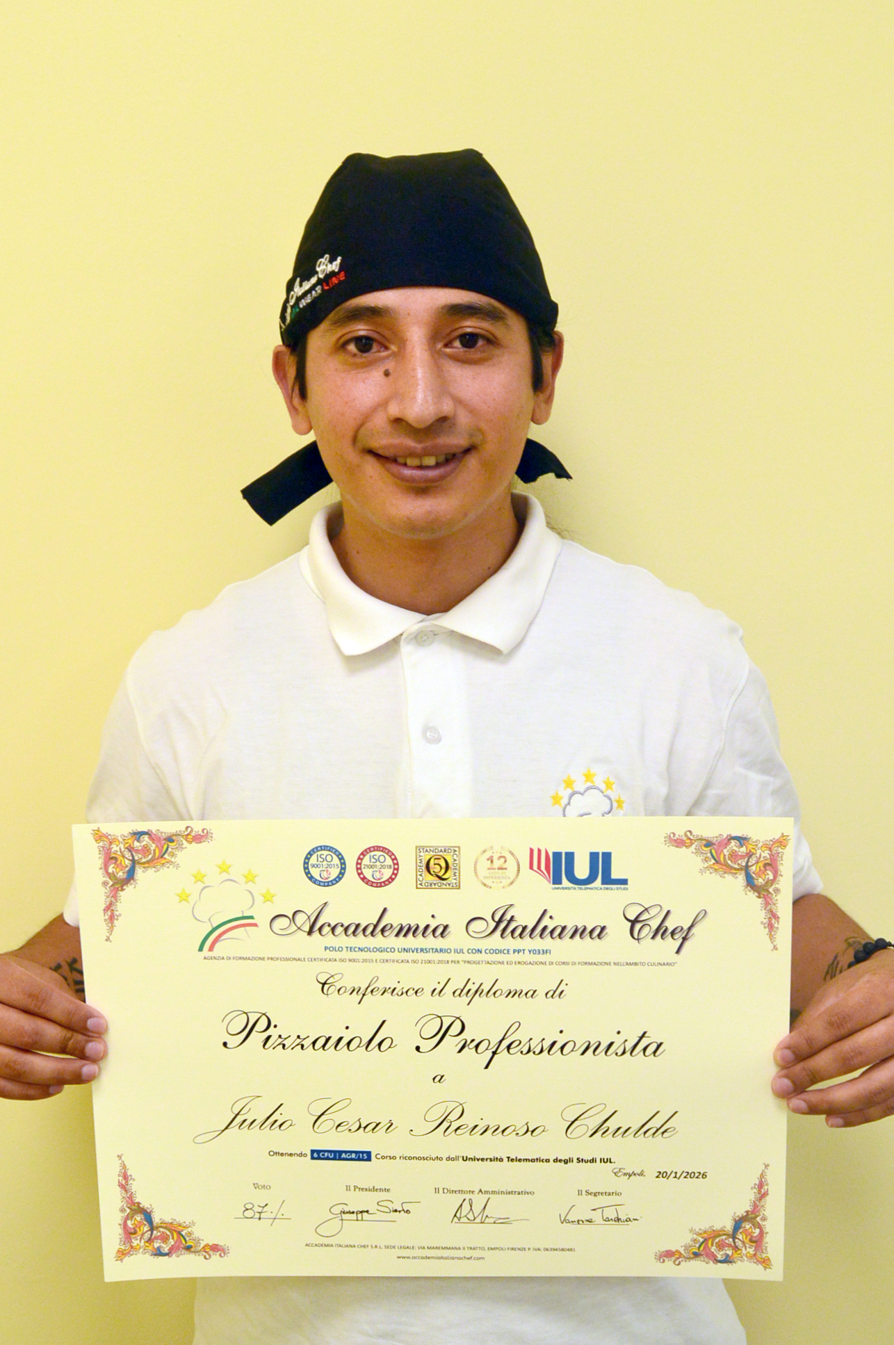 Nella sessione d’esame si è diplomato anche un bravissimo pizzaiolo: Julio Cesar Reinoso Chulde al quale è stato riconosciuto il diploma Accademico. Il Neo Diplomato ha dimostrato di aver raggiunto un ottimo livello di competenze professionali che gli consentiranno di affrontare con successo la carriera lavorativa futura. Il Diploma di Pizzaiolo Professionista è stato conseguito all’allievo dopo un percorso di lezioni teorico-pratiche presso l’Accademia, uno stage di 200 ore presso una Pizzeria, al quale poi ha fatto seguito la prova d’esame. Il bagaglio di conoscenze appreso sarà ora necessario per entrare nel mondo del lavoro, sia in Italia che all’estero.