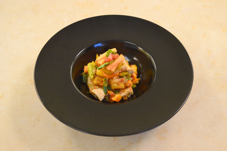 Pollo, platano e mix di verdure e ortaggi. Il platano viene fritto, il pollo rosolato in frittura; le verdure sono tagliate e cucinate con pepe bianco e curry dolce.